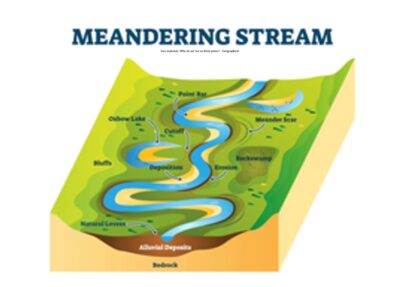 Notice the river’s flow or current. It is not the same speed from bank to bank. The difference in speed causes uneven sediment erosion and deposition, which causes the river to bend or meander.